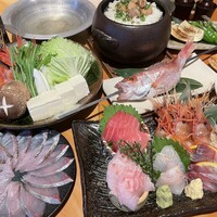 季節の食材と当店人気ののどぐろの塩焼きを組み合わせたコースです。その他赤字覚悟の名物刺身5点盛りや、その日仕入れの鮮魚を使った海鮮しゃぶしゃぶなどが揃う贅沢なメニューに仕上げています。 ※小分け提供をご希望のお客様は事前にご連絡下さいませ。