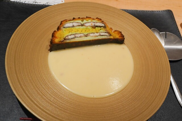 この日も定番料理と新しい料理のコンビネーションでしたが、最初に感動したのは秋刀魚のクレープ包み。秋刀魚のクセは控えめで見事に洋風料理になってます。厚みのあるクレープも日本人には...