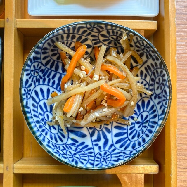 軽く説明を受けて、小鉢ビュッフェで好きなものを枠組みされたトレイに置いていきます。見た目...