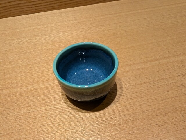 次に、たがわ?とかつおの炙ったのを、粒塩とワサビでいただきます。ここからは、お酒を信濃の国は駒ケ根の、信濃鶴に。杯は、いくつもある中から好きな柄を選べます。