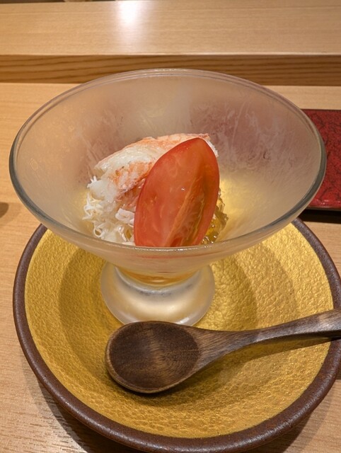 鮨は、うに、いくら、牛肉と続き、カニとトマトの冷製ジュレが入りました。