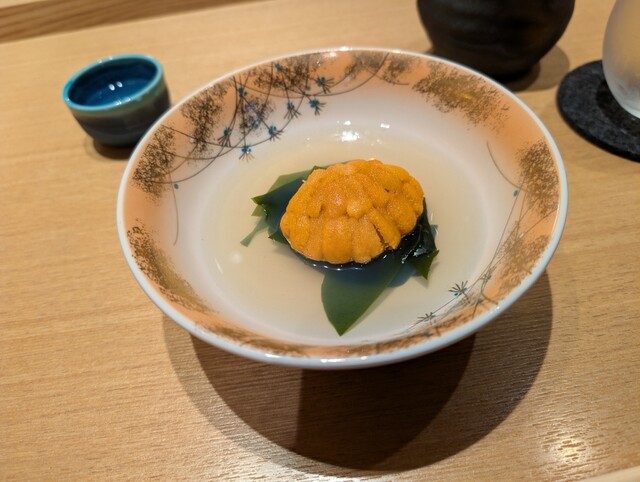 お次は、うにとわかめがおすましにぷかぷか浮かぶ一品。お匙でウニをすくい、信濃鶴を一口。