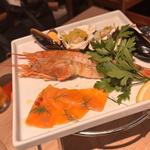 大切な後輩くんと、お昼に魚介+お肉が食べたいということで、飲み放題のついたシーフードプラッターもあるコースをいただきました。 シーフードプラッターのサーモン、エビ、牡蠣、ムール貝... 詳細を見る