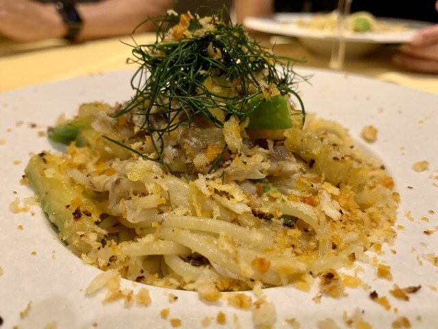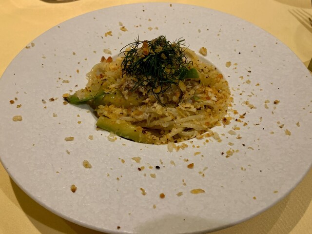 散らしてあるのはカラスミかな?と思ったらモリイカでした。イタリア語でパン粉という意味でローストしてあるのが特徴です。