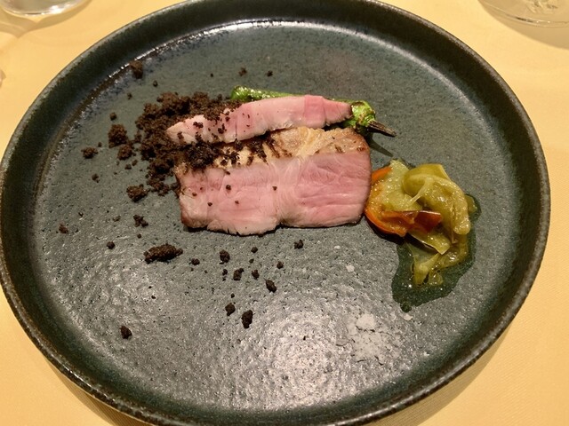 付け合せは獅子唐とピーマンが合体したシシピー。それとペペロナータ(たっぷりのパプリカを使った料理っていう意味らしいbyWeb)。ジャム的に使って食べてということです。