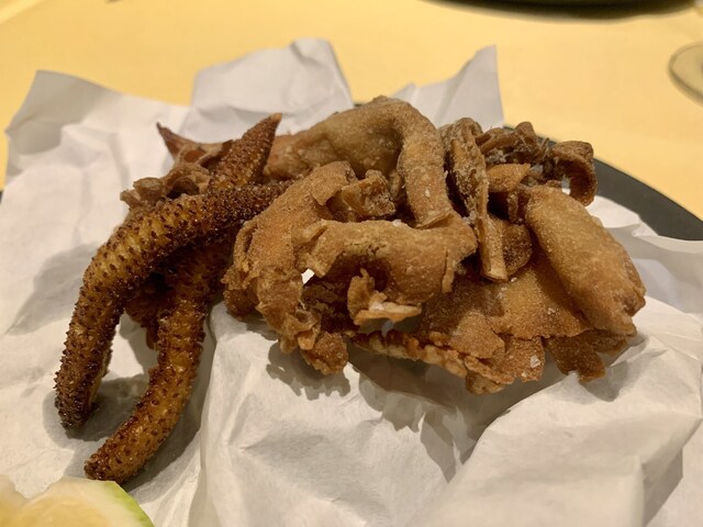 硬質小麦であるセモリナ粉をまぶして揚げてあります。色が黒めなのはそのためか、あるいは揚げ方によるものか。