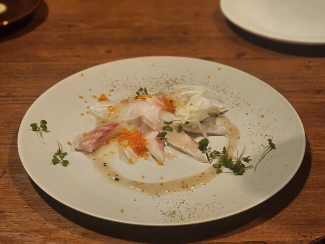 いよいよ料理…最初にいただいた鮮魚カルパッチョは、新鮮な魚の甘みがハーブとオリーブオイルで引き立ち、口の中でふんわり溶けます。