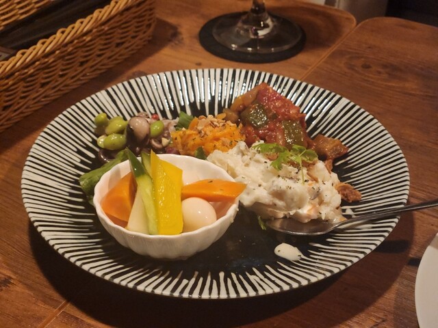 タパス盛り合わせは、ポテサラのブラックペッパーが効いたアルコールを注る感、イイダコの弾力ある食感、ラタトゥイユの野菜の甘酸っぱさが調和します。