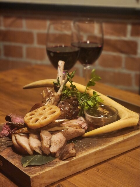 メインのジビエ肉盛り合わせは、蝦夷鹿の繊細な旨み、猪の力強い味わい、合鴨のジューシーさ、ラムチョップの香ばしさが一皿で楽しめます。