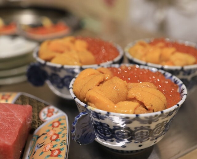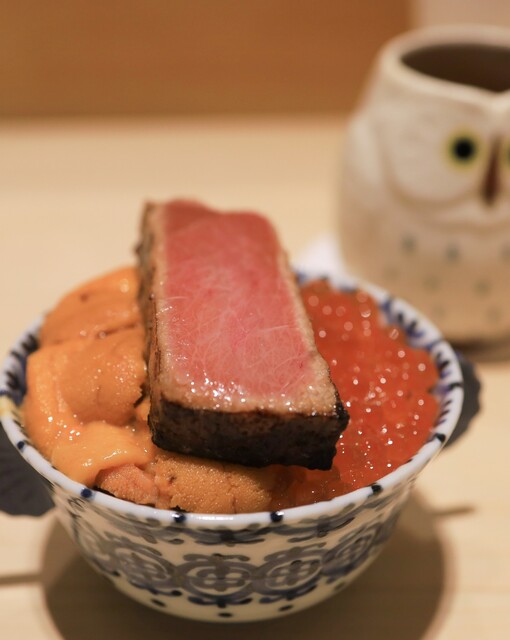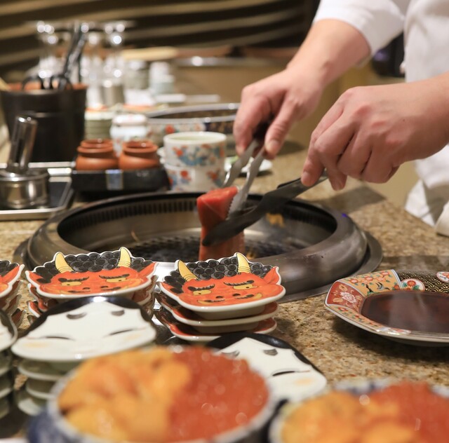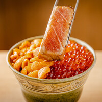 当店では、特上カルビは厳選した本鮪大トロを使用し、自家製の薬味やタレ、赤酢の酢飯と共にご提供いたします。自慢の三色丼コースでは、イクラやウニを贅沢に盛り付け、分厚い炙りトロが器に美しく重なる一皿をご用意。