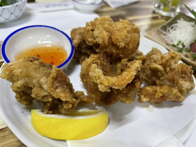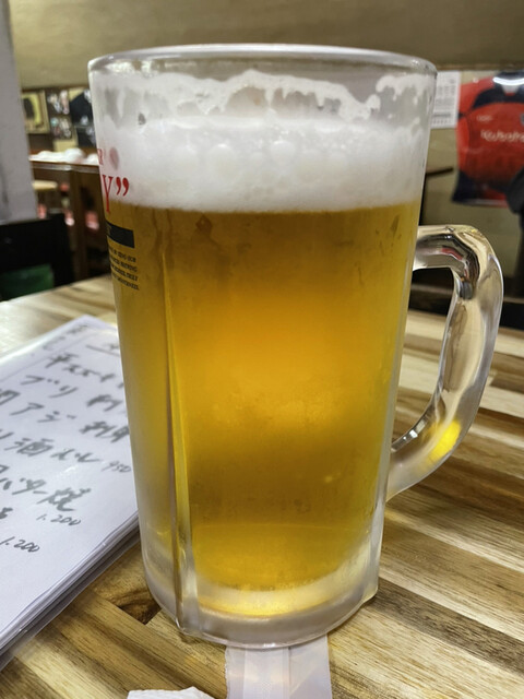 注文は、フィッシュ&チップス・マグロブツ・ホタテバター×2・鶏唐揚・きゅうり一本漬け。ドリンクは、スーパードライ大生。