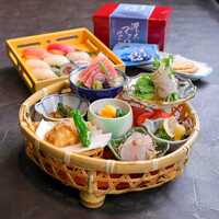 近畿大学で養殖された人気の近大マグロ、和歌山県産の食材を含めた前菜7種類の竹籠に、近大マグロと近大卒の魚の握り寿司。120分の飲み放題付きで、同窓会や皆様でのお集りに最適です。 ※当日の仕入れ状況で、内容が異なる場合がございます。