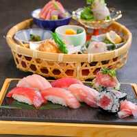 【数量限定販売】 近畿大学で養殖された人気の近大マグロ、和歌山県産の食材を含めた前菜7種類の竹籠に、近大マグロの握り寿司がメインとなる近大御膳。事前ご予約の方だけのワンドリンク付♪ ※当日の仕入れ状況で、内容が異なる場合がございます。
