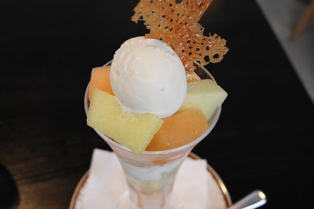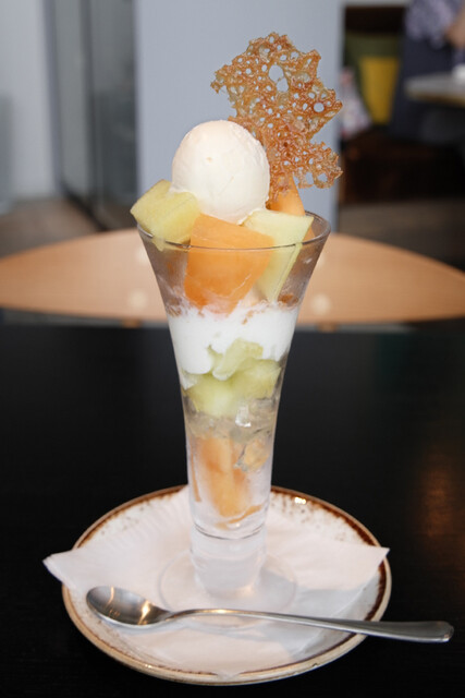 ミッドタウン日比谷3階でのランチ帰りにポスターでこちらのお店がメロンパフェを提供しているのを発見。紹介文には「至極のデザート」という自信に溢れた記載が。至極を求めて早速次の日にお伺いいたしました。明るく開放感のあるカジュアルな店内、気温が厳しくない日はテラス席も気持ちが良さそうです。
