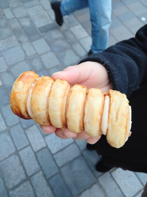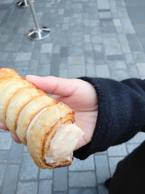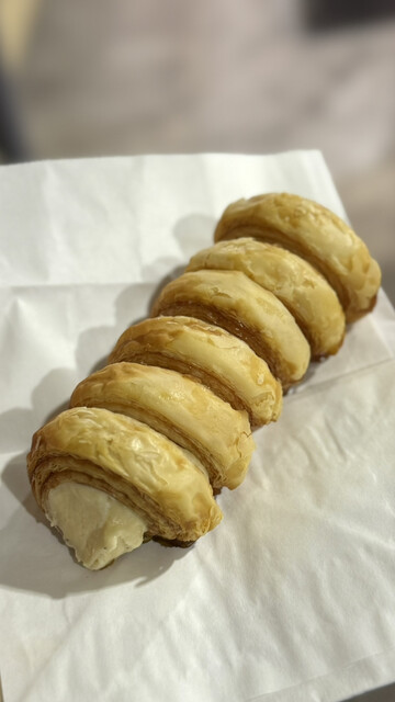 「クニャーネ」370円 パイの幸せな香りが豊かにし、サクッサク、そしてザクッザクッなパイ生地は美味しい! ハマってしまう食感にビックリしました!! ある程、パイ生地というよりもクロワッサンに近い気がしました。 流石、パン屋さんの人気商品! 中のクリームは口溶けがよく、スーッと消えていく... 詳細を見る