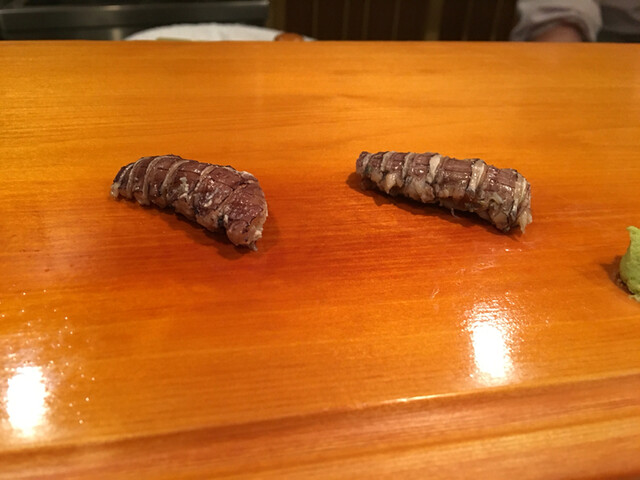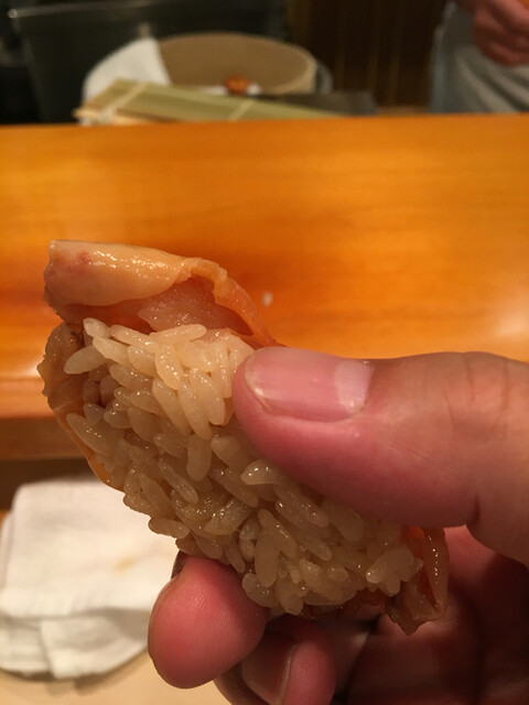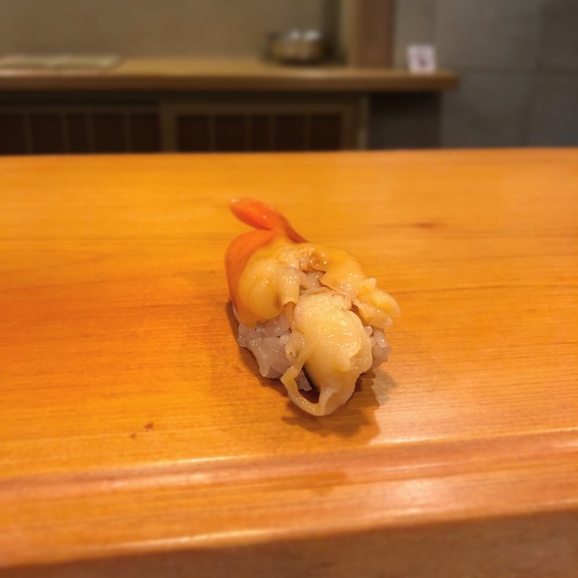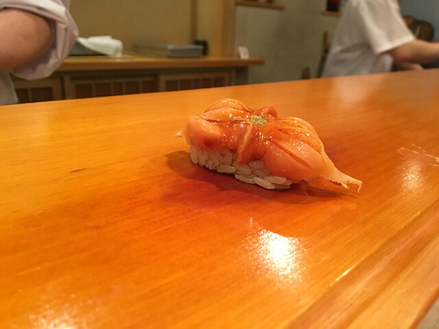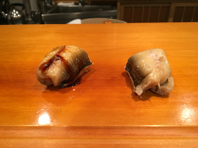 15.蒸し鮑・・・柔らかな仕上がり、鼻腔をとらえて離さない香り、ねっとりエロティックな旨味が酢飯の酸味に押し上げられ昇天します。プルンと揺れる蒸し鮑の柔らかな食感とハラリと解れるドライな酢飯が究極のバランスで絡み合います。