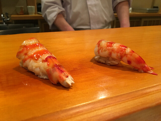 10.車海老・・・美しく色止めされた車海老は人肌の温度帯で酢飯の酸味にその甘みを優しく香らせます。