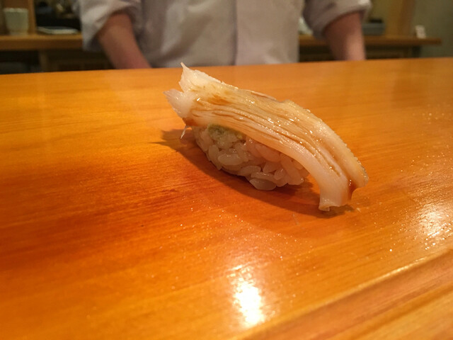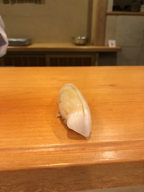 7.トリガイ・・・でかい!素晴らしいポーションの握りです(^.^)ドライな輪郭の酢飯が優しい余韻でトリガイの甘みを包みます。