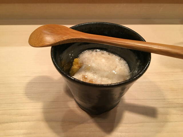 ☆鮑の肝塩辛・・・これね〜ヤバイです。塩味のキレが鋭く歯を当てると張りのある肝がプチンと弾け美しい旨味が差し込みます。ビールじゃ肝に申し訳ないのでここで日本酒をお願いします。
