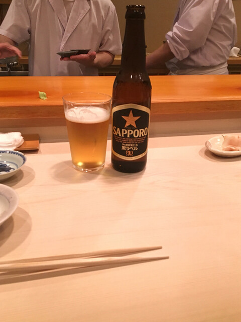 ビールの小瓶に冷酒を2合!清水さんの前で頂く赤酢の握りはどれも外れなし!ここでは時より聴こえる喧騒もいい酒の肴です。