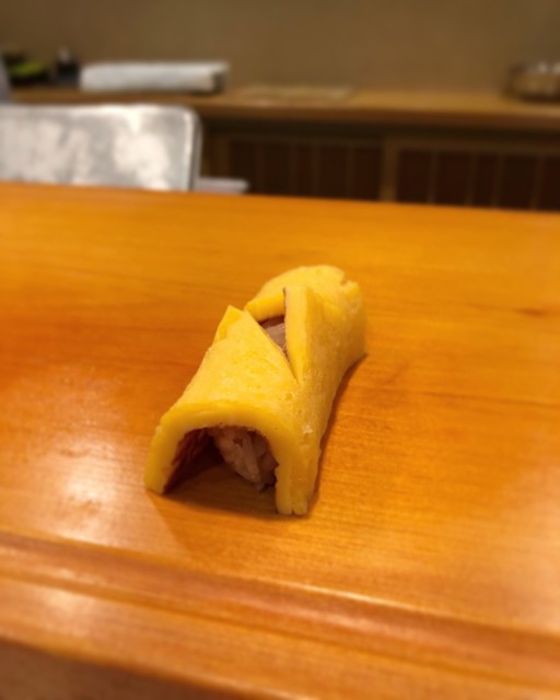 13.鞍掛の玉子焼き・・・鞍掛スタイルのクラシカルが新ばししみづ風!冷たい温度帯の玉子に酢飯の酸味が香り立ちます。