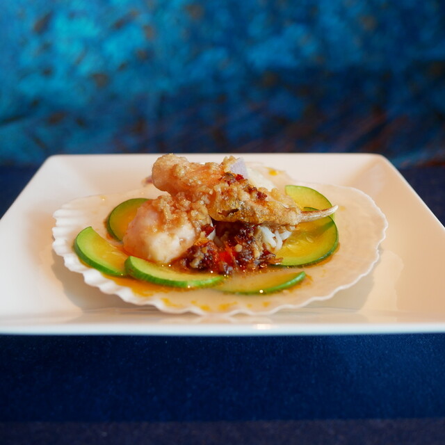 ひときわ目をひく高さ8メートルのワインセラーや、ブルーで統一されたスタイリッシュなインテリアが印象的な空間で、洗練された味わいと斬新なプレゼンテーションが特長の広東料理をお楽しみいただけます。