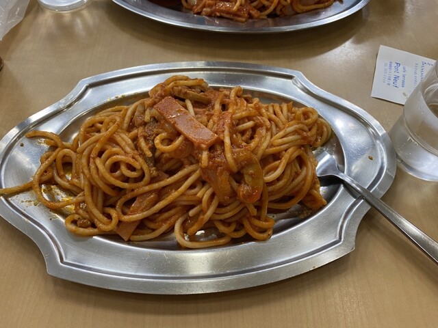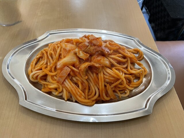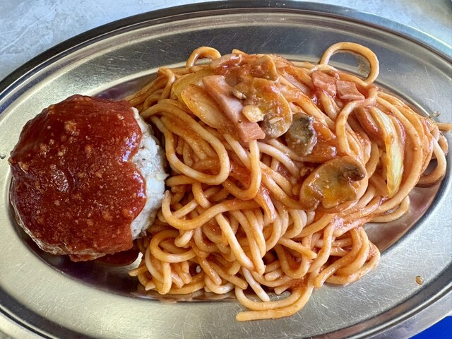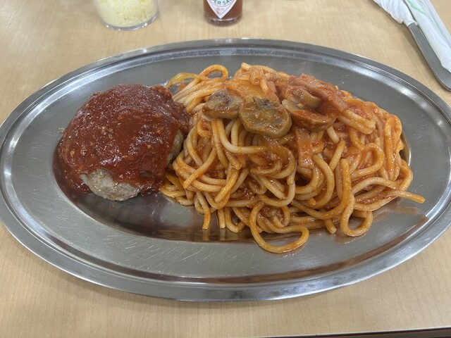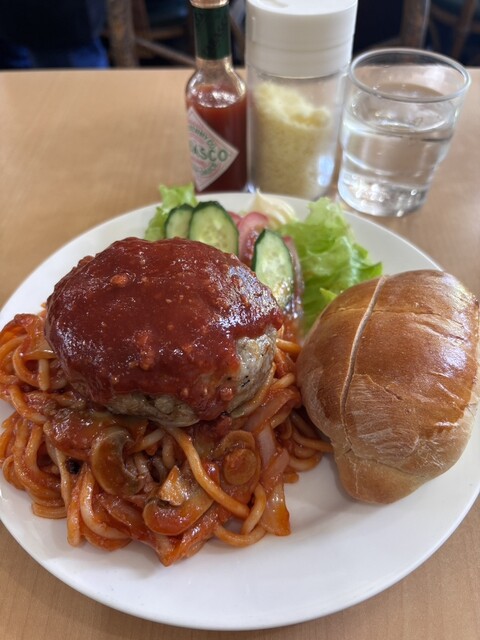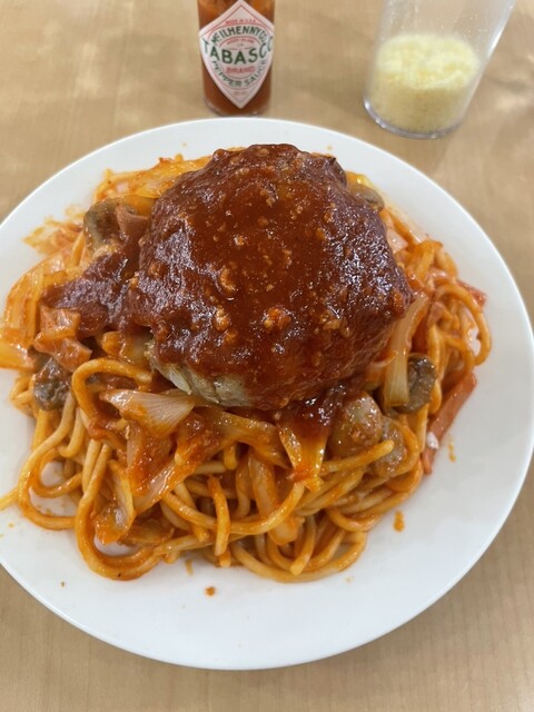 閉店間際に駆け込み、店内空いていてスムーズに入店、ナポリタンハンバーグの大盛り、柔らかい麺が特徴的だがもう少し硬めが好み、ハンバーグも肉肉しい感じでおいしい、麺はかなり量があるので普通盛りでも十分だったかも
