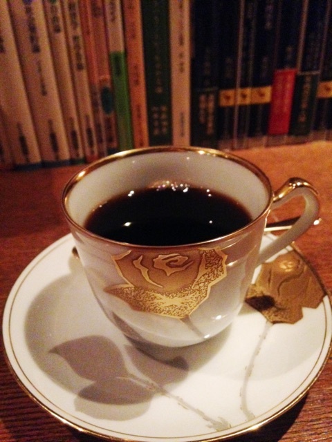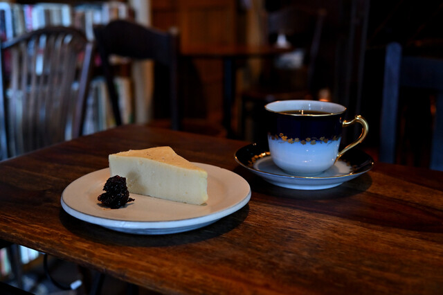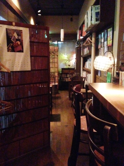 そっと、暖簾をくぐり店内に恐る恐る入ると奥から「いらっしゃいませ。お好きなお席へどうぞ」と声が。目の前は確かに古書の本棚が・・・。