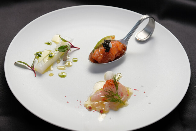戻り鰹とグリル柿のブーケサラダ (by お店)