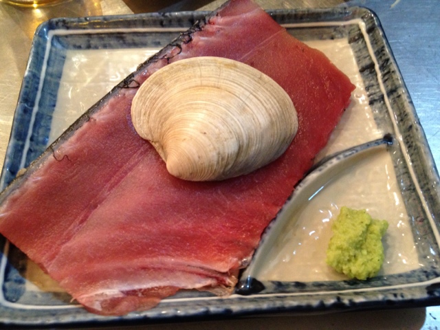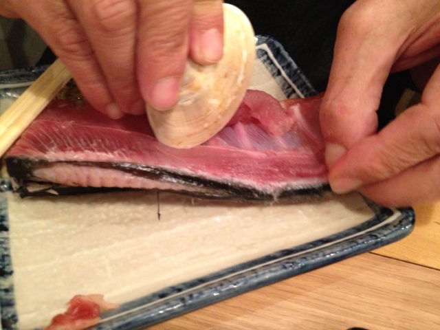 鮪の骨付き中落ちは、まんまの状態で、中落ちの身をこそげる為の貝殻がついてくる。野趣あふれる企画で、これがなんと¥80円‼