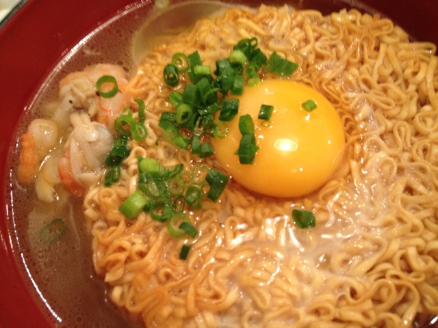 これは、チキンラーメンにイカやエビなどを炒めたものと生卵を落として三分待つというもの。