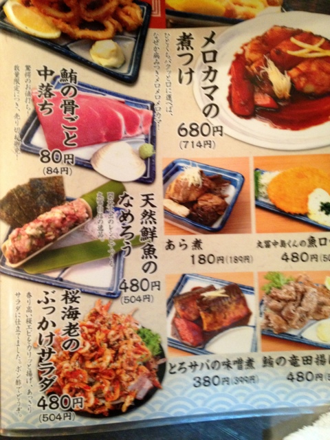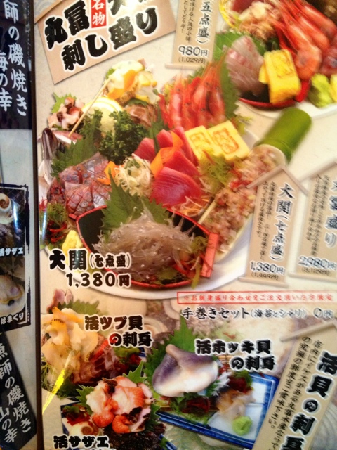 中は満員の客と所狭しと貼られたメニューが活気を演出している。ここはやはり、刺身だ。
