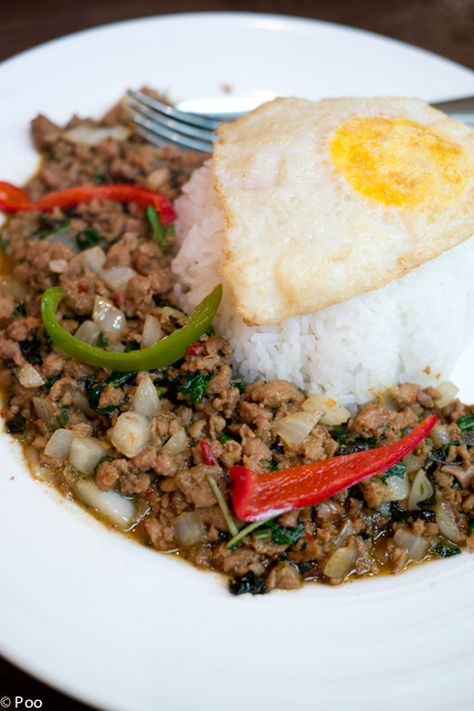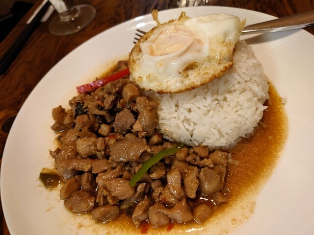 ガパオライス。ニンニク、唐辛子、ハーブなどの刺激は控え目でマイルド。辛さが穏やかで食べやすい。個人的...