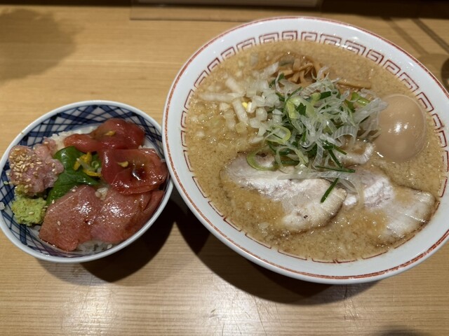 ラーメンとマグロ丼の組み合わせが良いとの事で、醤油ラーメンこってり+マグロ丼をオーダー。麺は平打ちぢれ麺でやはり喜多方と言う感じ。スープは...