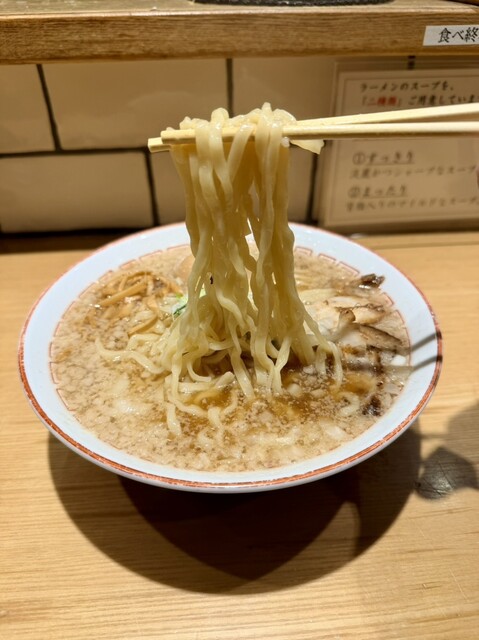着座時に「すっきり」か「まったり」を選べます。今回はがっつりいきたかったのでまったりの背脂入りのマイルドなスープを選択。見た目から背脂が良い感じでキラキラと蔵出し味噌ならではのコクと深みがありつつ、く...