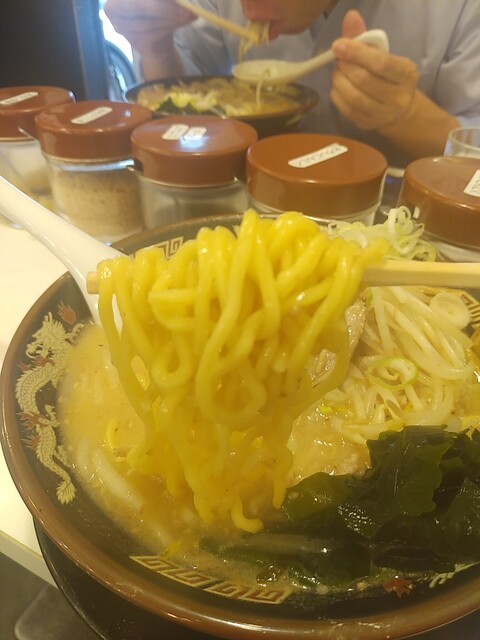 北海道のラーメンで味噌ラーメンなのだろうと思い、味噌ラーメンを買おうとしましたが、背脂味噌という文字がきになり背脂味噌ラーメン(1100円)を購入。店員さんに食券を渡すと、「大盛りでいいですか?」と聞かれるので思わずハイと答えてしまう。大盛りが無料なのはありがたいが2軒目なのでそれほどお腹が空いていないので大丈夫だろうかとちょっと心配。