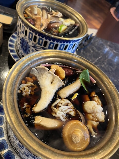 以前から気になっていた薬膳きのこ鍋。8000円の美麗コースを予約して訪問しました。店内は比較的女性比率が高いです。1人ずつブラックスープが運ばれ、きのこや野菜等を各自入れて食べます。このスープがとても...