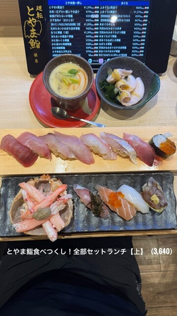 平日も行列で話題のとやま鮨。ずっと気になっててやっと行けました。平日限定の9品3990円のコースは、刺身、前菜、揚げ物、茶碗蒸し、寿司…びっくりする程お得な神コスパコースでした。単品で頼むと結構リッチ...