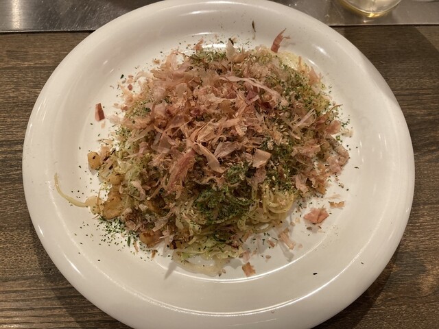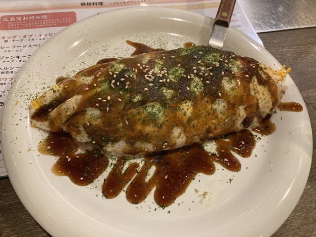 目の前の鉄板で焼いてくれ、オタフクソースでベースの味をつくった、熱々でしっかり量のある広島焼きは、味変の楽しみも含めて、とても楽しめる一品であった。