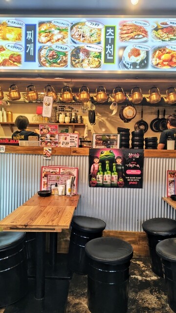 JR新橋駅汐留地下改札口から徒歩2分、地下街を経由して、新橋駅前ビル1号館にあります。 店内からはみ出してテーブル席が設けられ、全てに客が埋まるくらいの人気店です。 座席はペール缶に座布団を敷いた簡素なもので気軽さを感じさせます。 料理はさまざまな韓国料理が並び、アルコールも韓国ものがあります... 詳細を見る