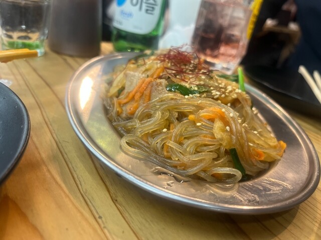 レストランフロアに、韓国料理っぽい店がすぐに見つかり、店外テーブル席へ。冷水が運ばれてきて、メニューから、すぐに、口頭注文。