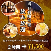 【当日OK】単品飲み放題コースです。女子会や親しい友人との飲み会、二軒目使いにもピッタリ!!◎生ビール、豊富なサワー・カクテル各種・焼酎・ウイスキー・等、大勢のニーズにお応えします!!アルコールが苦手な方でも、ソフトドリンクを多数ご用意◎席のみのご予約になります。料理等は当日お店にてお選びください。お1人様料理2オーダー制になります。