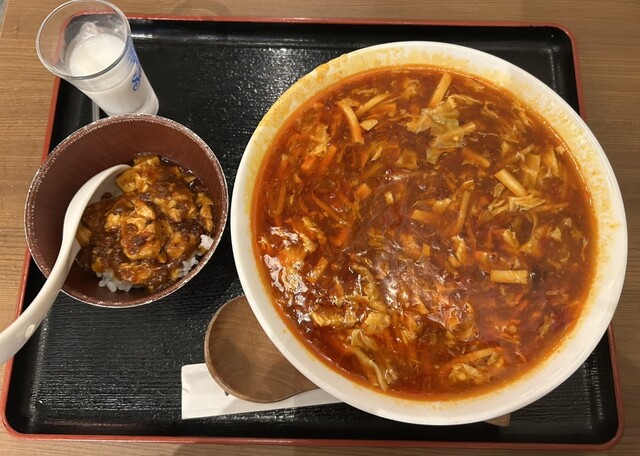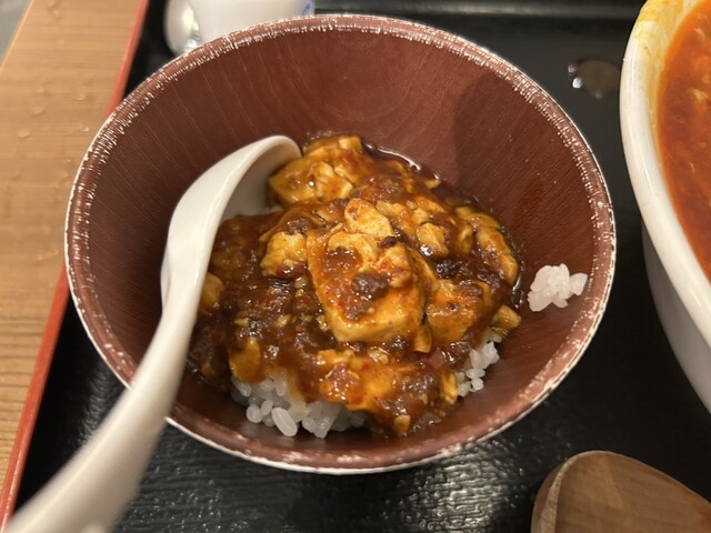 このセットは麺にミニ麻婆丼と小さな杏仁豆腐がついてきます...