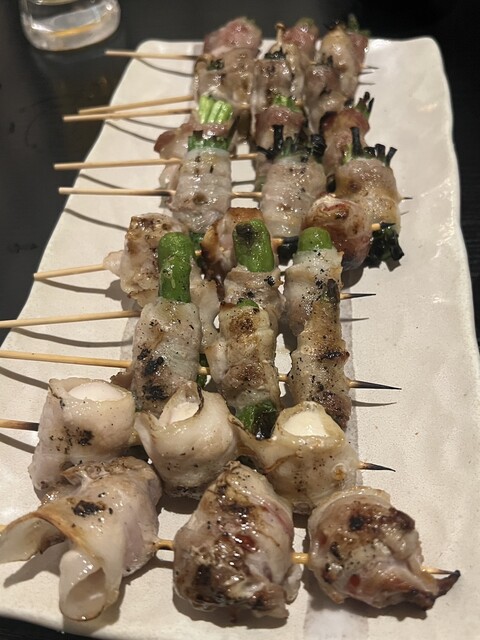 野菜巻きはアスパラやエノキ、ニラなど、さまざまな野菜が豚肉で巻かれており、それぞれがシェアしやすい大きさで提供されました。豚肉のジューシーさが野菜のシャキシャキ感を引き立て、タレと塩の両方の味付けを楽しめたのがポイントです。特にアスパラはシャキシャキ感があり、七味を少しつけるとピリッとしたアクセントも加わり、最後まで飽きずに楽しめました。