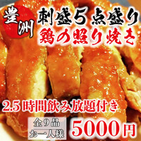 豊洲直送の鮮魚をふんだんに使用した海鮮サラダや、刺身五点盛り合わせ、ぷりぷりの海老や産直野菜の天ぷら、メインはジューシー鶏の照り焼きなど、全9品を贅沢に楽しめるコースはこちら!宴会に嬉しいちょっとゆったり2.5時間の飲み放題とご一緒に、心ゆくまでお楽しみください。♪
