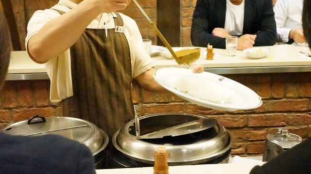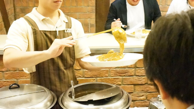 丸の内ビル群の一角の地下にあります。ランチタイムは行列ができることもあると聞いていましたが、休日の14時頃ということもあり、1/3の席は空いていたと思います。大阪発祥で長年続くカレー専門店として知られ、甘さと辛さのコントラストが特徴のお店です。