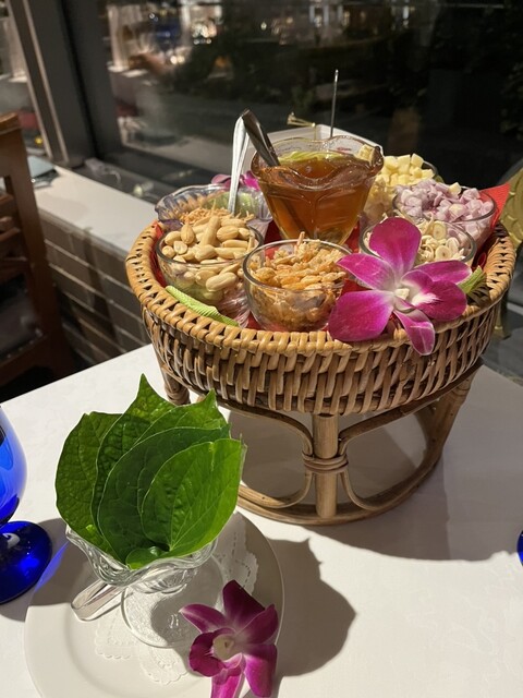 初っ端のミエンカム、もう色んなスパイスやらなんやらをごちゃ混ぜにして胡麻の葉?に巻いて食べるんだけど、メチャ美味しかった。