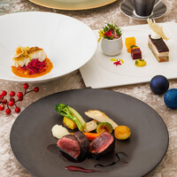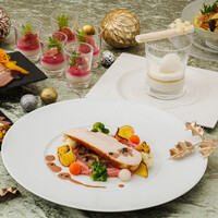 乾杯のスパークリングワインから始まる全7品のクリスマスランチコース。前菜は丁寧に調理した“大山どり”を重ね合わせた、スパークリングワインと相性ピッタリの一皿。メインディッシュには柔らかで淡白な肉質の鹿肉ロースを、フランボワーズソースと共に提供いたします。締めくくりのデザートは、切り株を模した伝統的なクリスマスデザート、“ビュッシュ・ド・ノエル”でクリスマスムード溢れるランチコースを展開いたします。