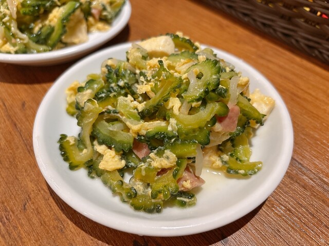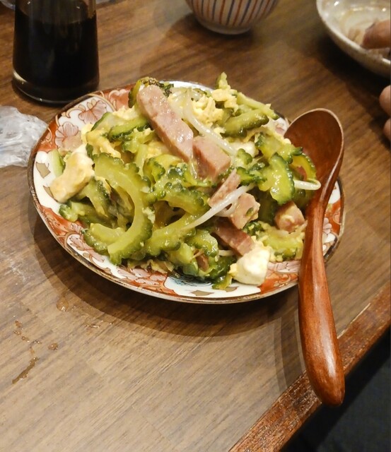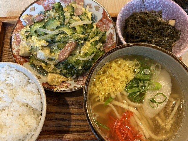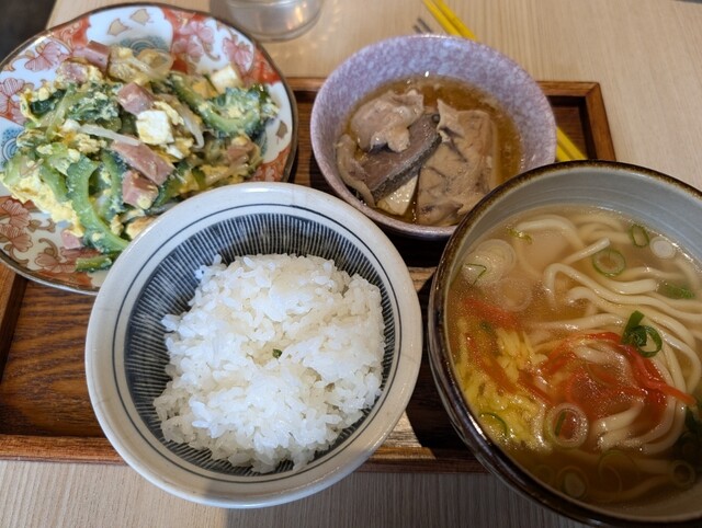ゴーヤチャンプル、沖縄そば、切り昆布の煮物がついた定食。ゴーヤチャンプルはねっとりしている。少し片栗粉が入っているのかな。ゴーヤの量が多めなのが嬉しい。