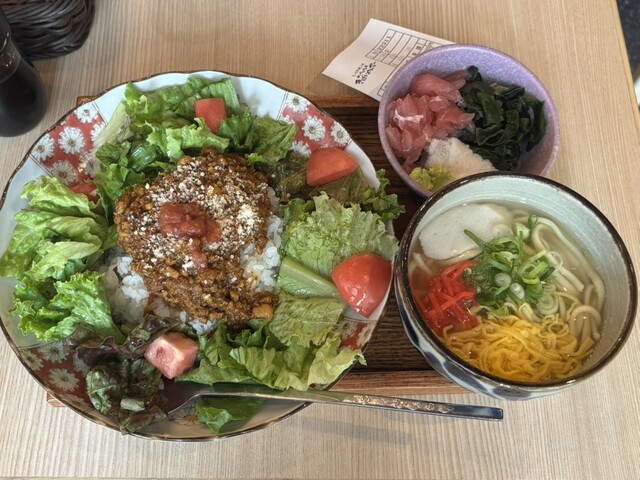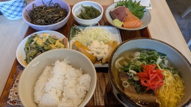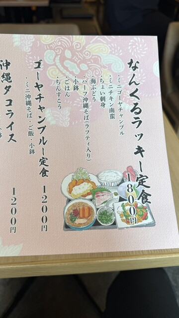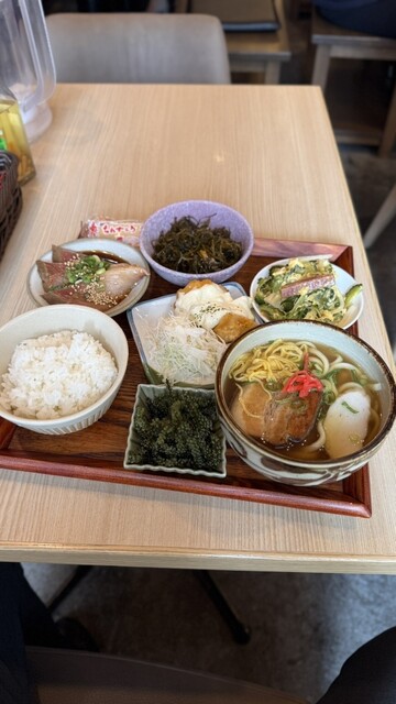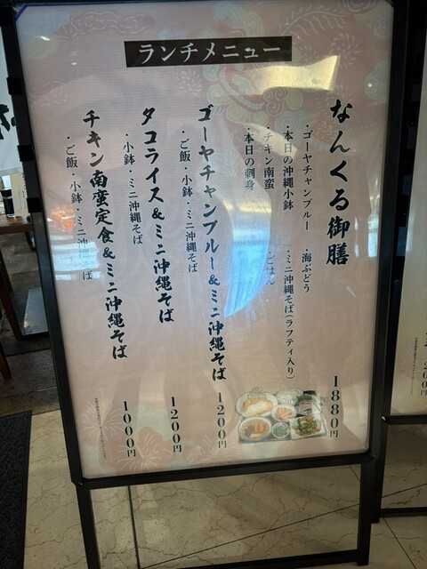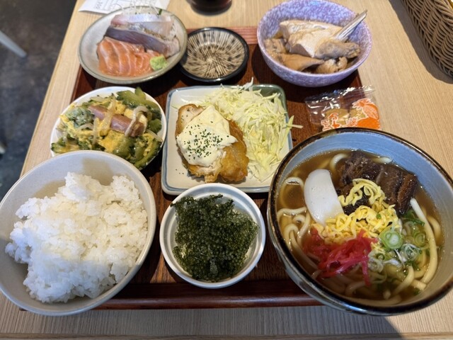 2025年9月11日(木)AM12時訪問 なんくる御膳1,880円注文 沖縄そばやゴーヤチャンプル、刺身、チキン南蛮、海ぶどう等少量ずつですがお腹いっぱいになりました。スープが美味しいと更に評価ア...
